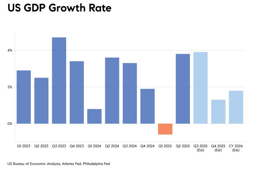 Economic forecasters broadly expect U.S. growth to continue into 2026, supported by easing monetary policy, elevated government spending, early-stage AI investment, and unusually strong household balance sheets.