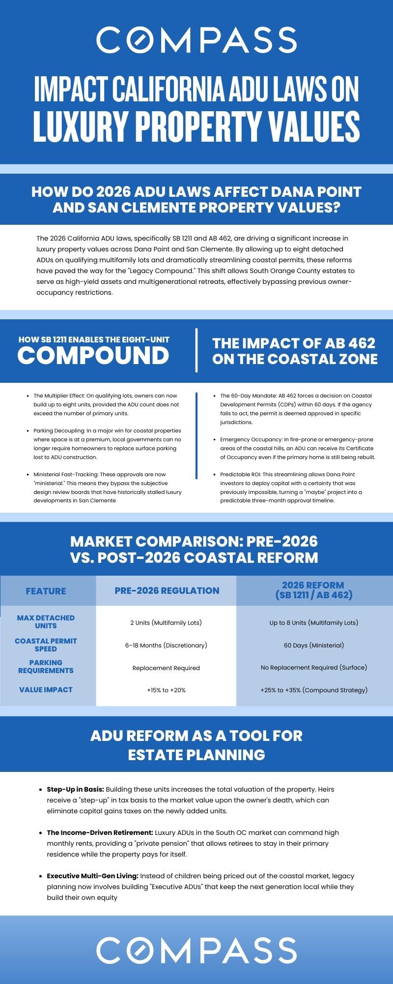 The California ADU laws impact in Dana Point and San Clemente goes far beyond adding small guest houses. It is changing the meaning of luxury ownership in these coastal markets. A high-end property is no longer judged only by the main residence, the view, or the finishes. It is also judged by flexibility, future use, and family planning potential.