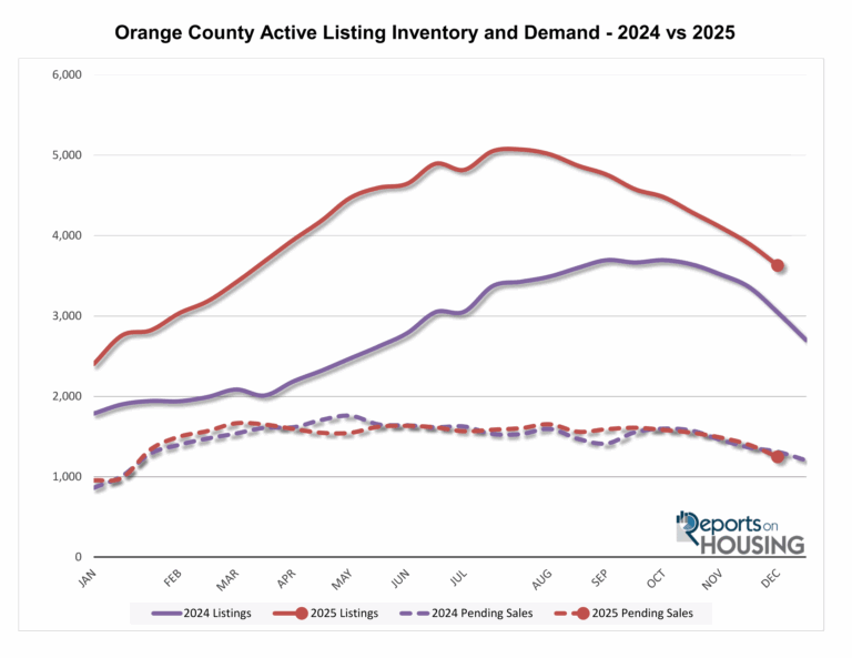 The active listing inventory in Orange County dropped by 268 homes over the past two weeks, a 7 percent decline, bringing the total to 3,629 homes, its largest drop of the year and lowest level since March. Since peaking in July at 5,071 homes, inventory has fallen 28 percent or 1,440 homes, a typical seasonal trend as sellers delist during the slow Holiday Market.